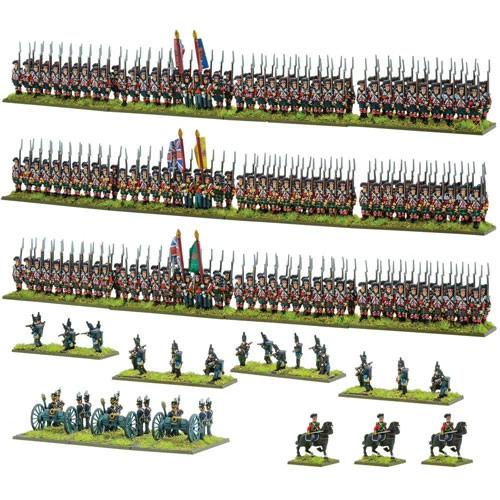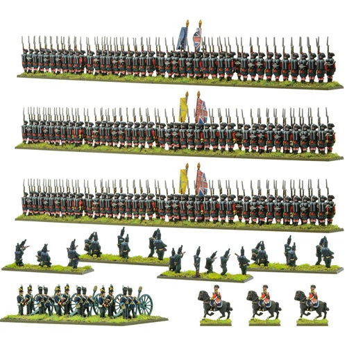 No British army is complete without the splendid Rifle Brigade! Three battalions of the 95th fought at Waterloo in their trademark dark green uniforms. Their efficiency with the Baker rifle was well known to the French, who really did not like to face them! The vast majority of the three units fought in line and square at Waterloo, some famously deployed in skirmish order in the sandpit next to La Haye Sainte. These figures can also be painted to portray the brave German defenders of that vital farmhouse. Finally, we have three 5.5″ howitzers in support from the Royal Artillery, lobbing shell-after-shell high over the heads of their troops and onto the French lines.