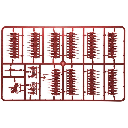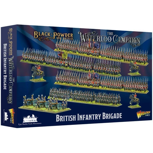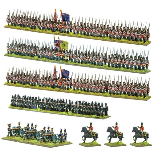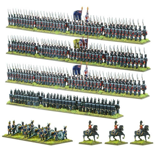 This plastic set provides enough models to field a complete brigade of three British line infantry regiments of 80 men each, a regiment of 95th Rifles with 60 men, a 3-gun Royal Artillery 9-pdr battery and three mounted brigade commanders.