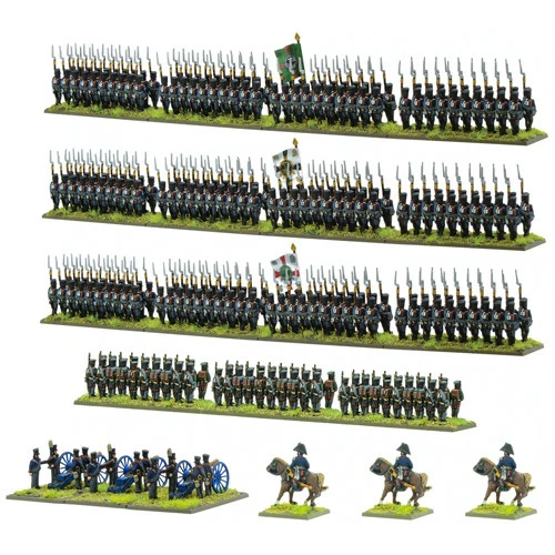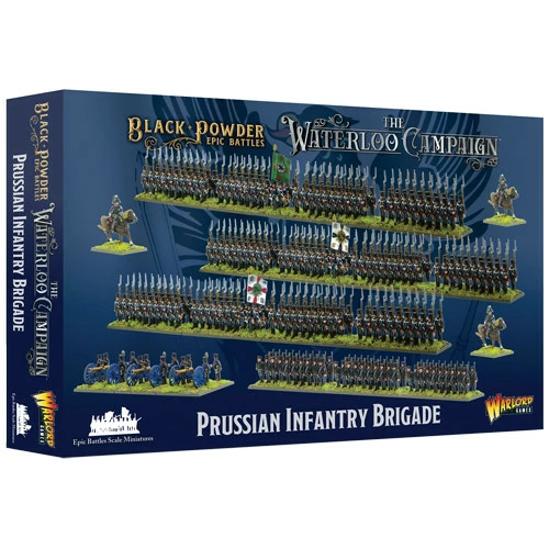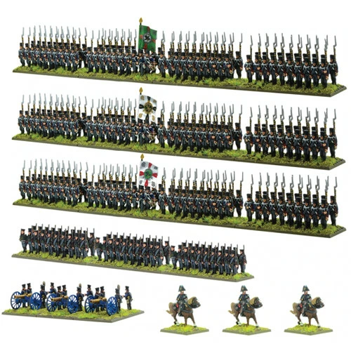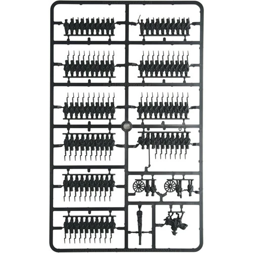 This plastic set provides enough models to field a complete brigade of three Prussian line or light infantry regiments of 80 men each, three bases of jägers, a 3-gun Foot Artillery 12-pdr battery and three mounted brigade commanders.