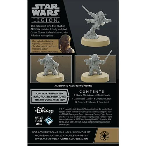 This expansion adds this legendary Jedi to your Star Wars: Legion collection, beginning with two beautifully detailed, unpainted Grand Master Yoda miniatures that can be assembled in a variety of poses, such as leaping into battle or concentrating while reaching out with the Force. All of Yoda’s skills, including his deep connection to the Force, are laid out on a unit card and his three signature command cards. These substantial powers can be further augmented by eight upgrade cards that grant him new Force powers and ways to command your armies. Finally, this expansion also includes a Republic unit card and an additional command card for the mighty Wookiee Chewbacca, allowing you to use your existing miniature in this faction.
