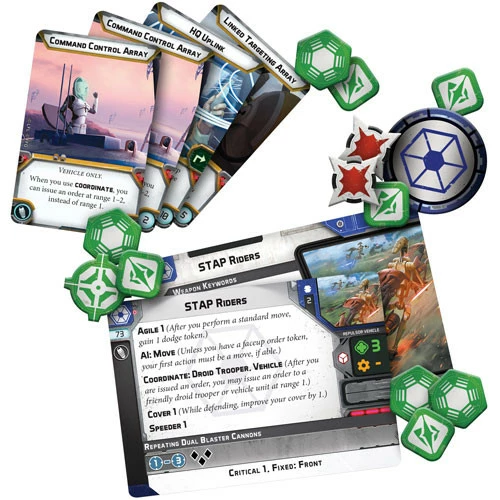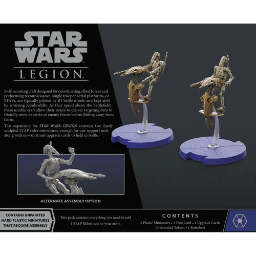 Within the STAP Riders Unit Expansion, you’ll find two beautifully detailed, unpainted STAP rider miniatures that featuring a number of customization options. Two different flight stands let you depict them at different heights, while the STAP pilots themselves can be assembled in a variety of poses. Finally, four upgrade cards invite you to equip them with comms systems to more fully integrate your STAP riders into your army.