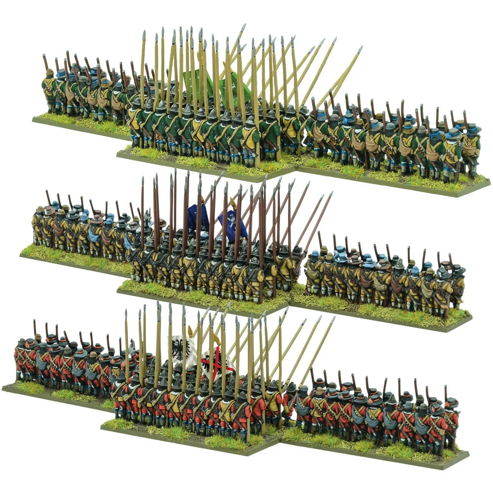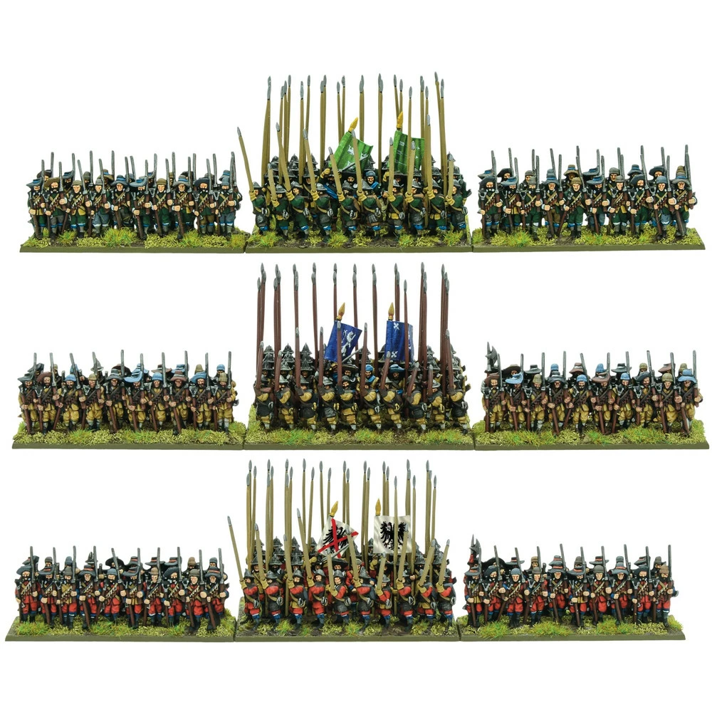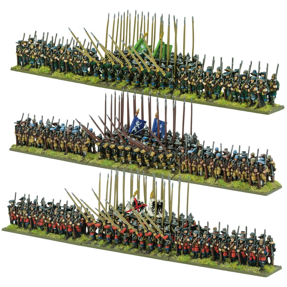 This boxed set contains three plastic combined Pike & Shotte regiments (40 pike and 40 musket, including command represented in each), plastic bases and a full-colour flag sheet containing colours for both sides in the Thirty Years’ War.